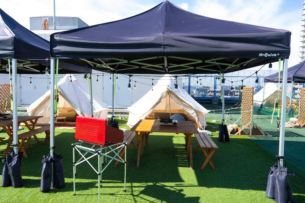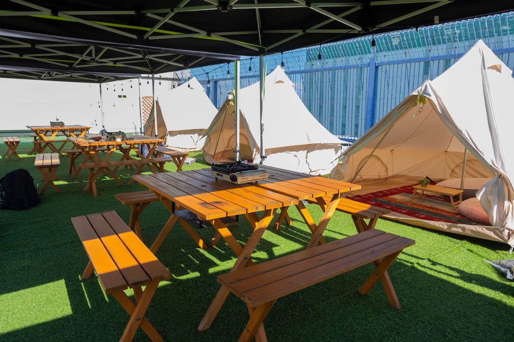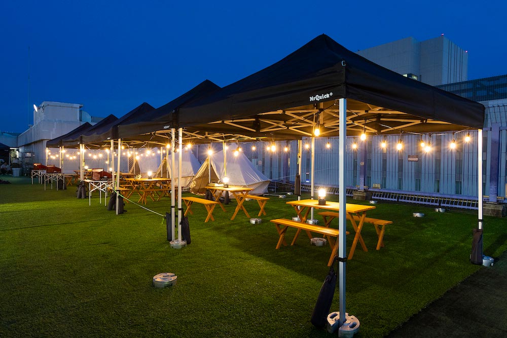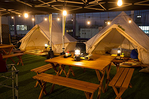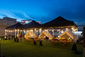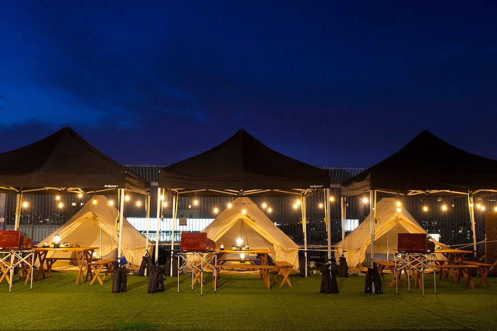 最大96名様までご利用可能なグランピングテントも完備。天候の心配不要です。
