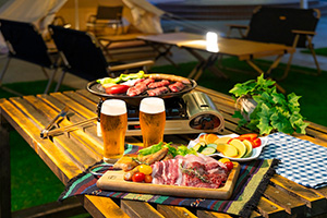 そんなカルチャーの中から生まれた「グランピング料理」そして、グランピングには欠かす事のできない、マルチグリドルを使用したオリジナルスタイルにてご提供いたします。